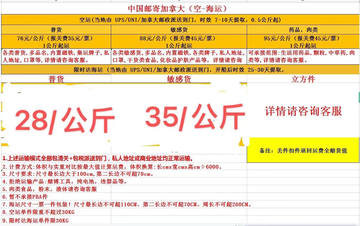 中国至加拿大集运;海运+空运,加拿大境内免费送货上门